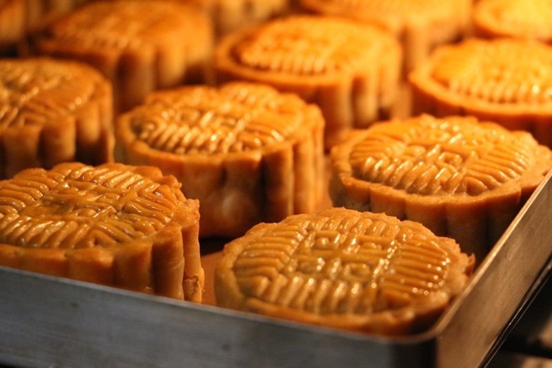 3、月餅烘烤分二次進行:(1)烤至表面微帶黃色、出爐刷蛋黃液;(2)月餅烤至表面金黃色,不塌腰。